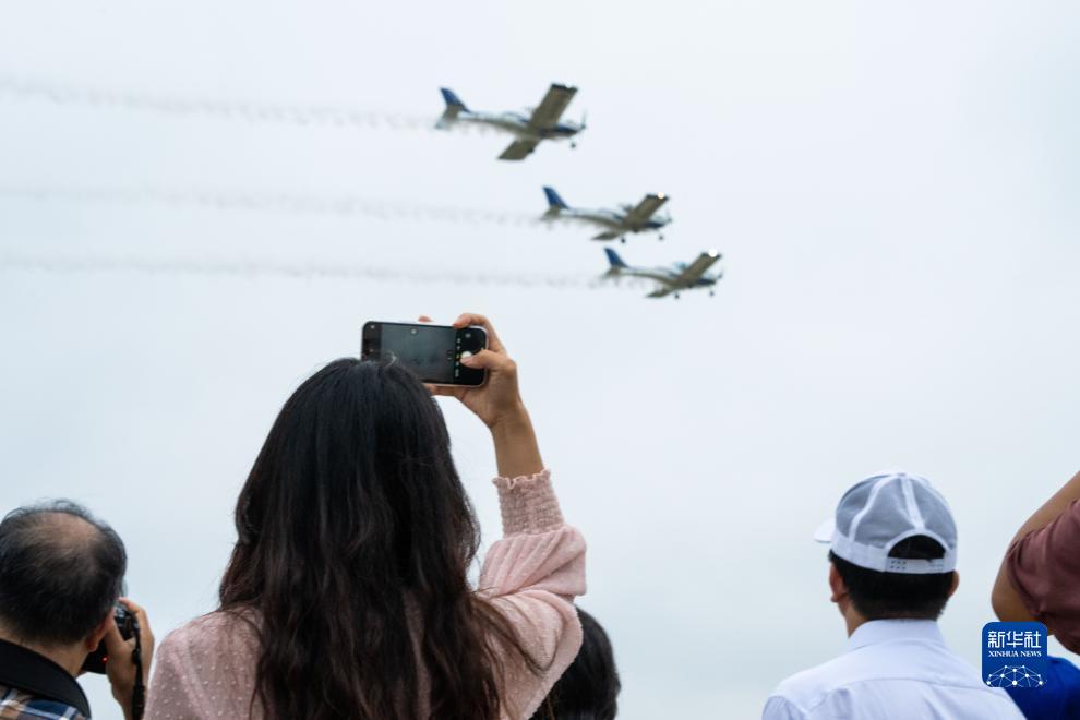 9月22日,在湖南株洲芦淞机场,观众在拍摄固定翼编队飞行表演。