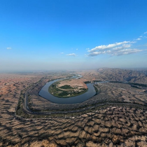 黄河在流经甘肃后,奔腾一路蜿蜒向东,在即将进入“几”字弯时划出一个完美的半圆,圆弧外是腾格里沙漠的无垠瀚海,圆弧内河水滔滔,满目苍翠。大自然的厚爱,让水和沙在宁夏中卫市沙坡头邂逅,形成沙水交融的独特景观。