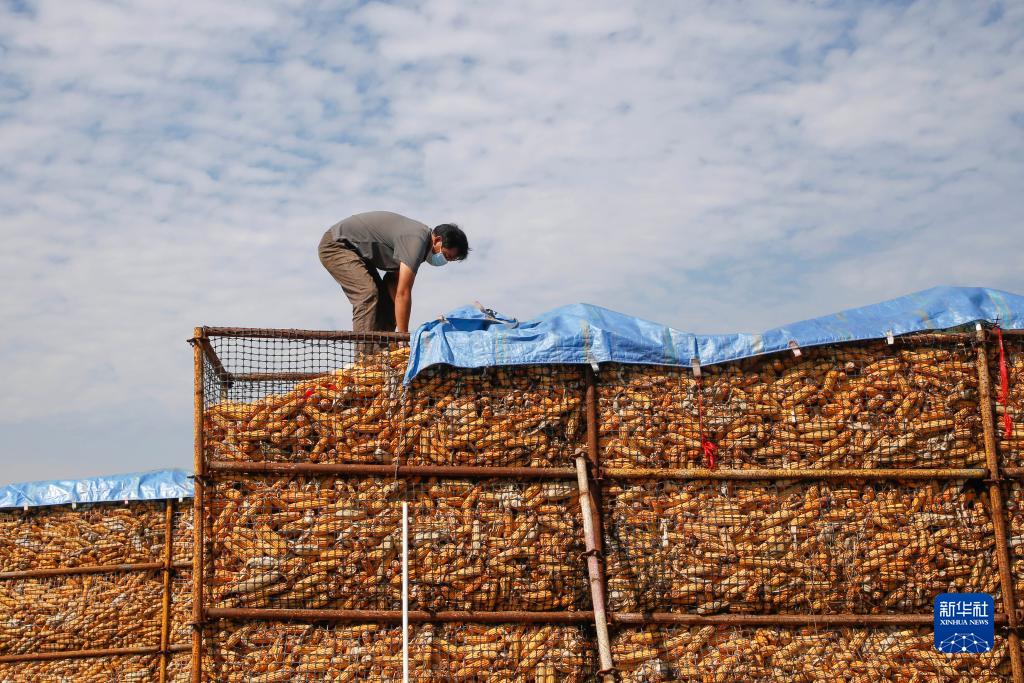 9月22日,在宝丰县闹店镇一家粮食收购企业,工作人员为存储玉米的铁笼铺盖防雨布。