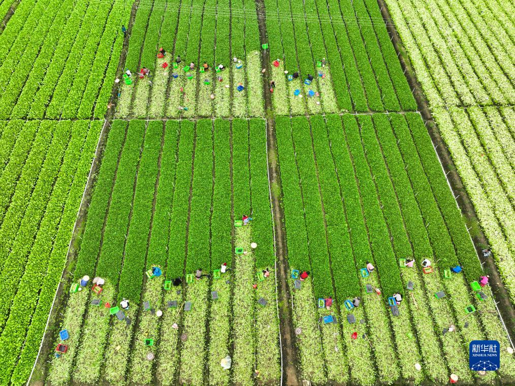 9月23日,在湖南省常宁市胜桥镇合泉村蔬菜种植基地,村民在采收蔬菜(无人机照片)。