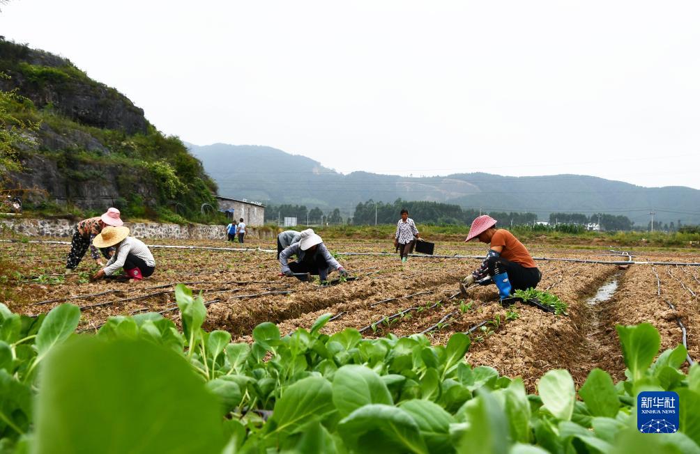 9月23日,湖南省永州市江永县潇浦镇下界头村,农民在移栽包菜苗。