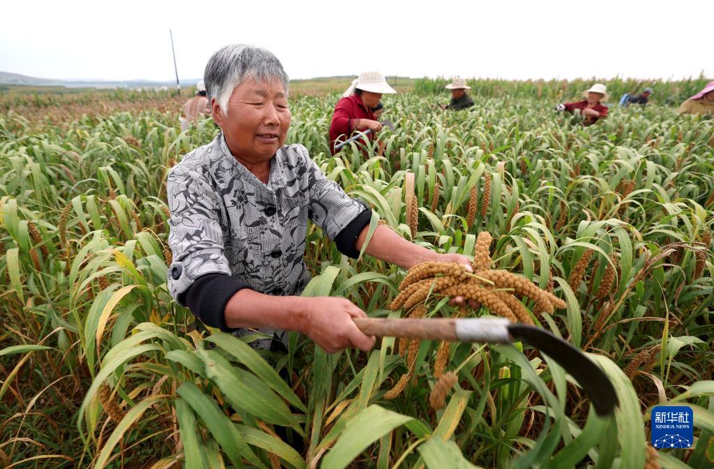 9月23日,农户在河北省石家庄市行唐县北河乡朱家庄村谷子种植基地收获谷子。