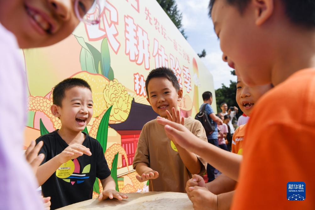9月23日,小朋友在农耕体验季活动上敲响“丰收鼓”。