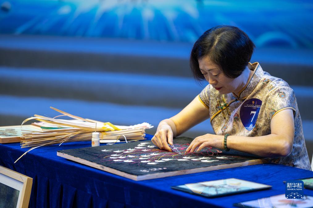 9月21日,选手刘荣萍在现场展示民间美术麦秆画技艺。