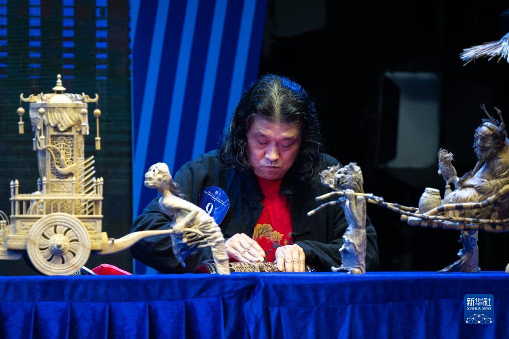 9月21日,选手徐海清在现场展示雕刻塑造(竹雕)技艺。