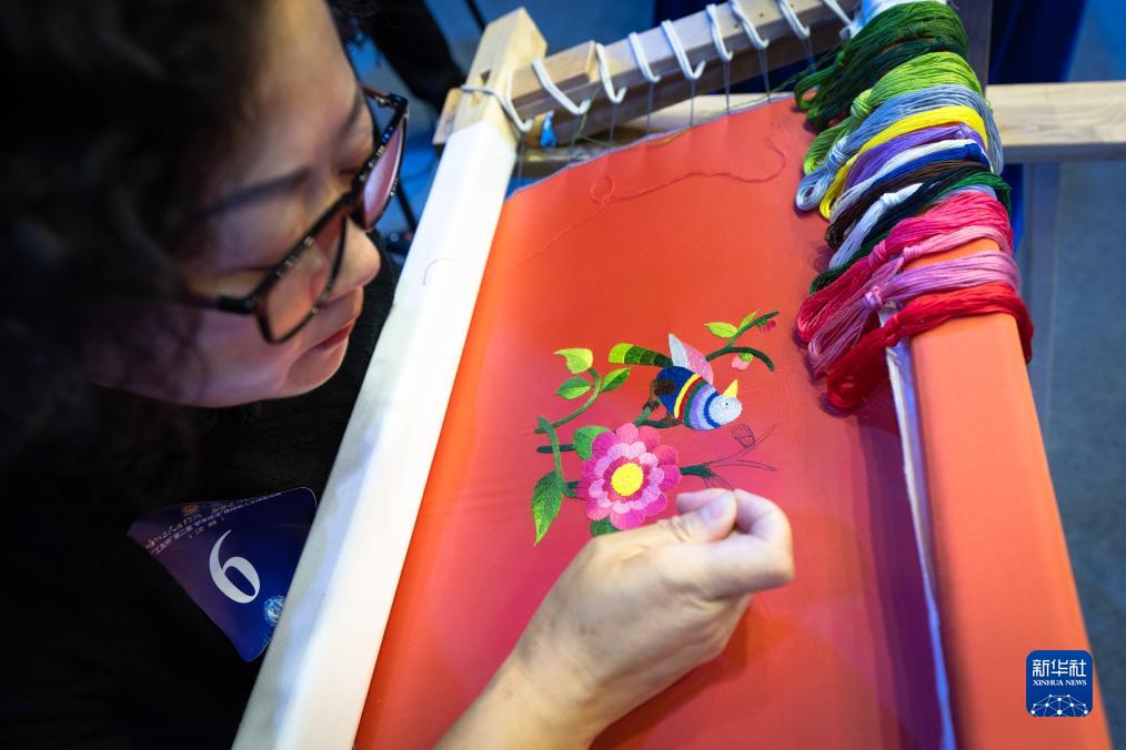 9月21日,选手陈红平在现场展示利川刺绣技艺。