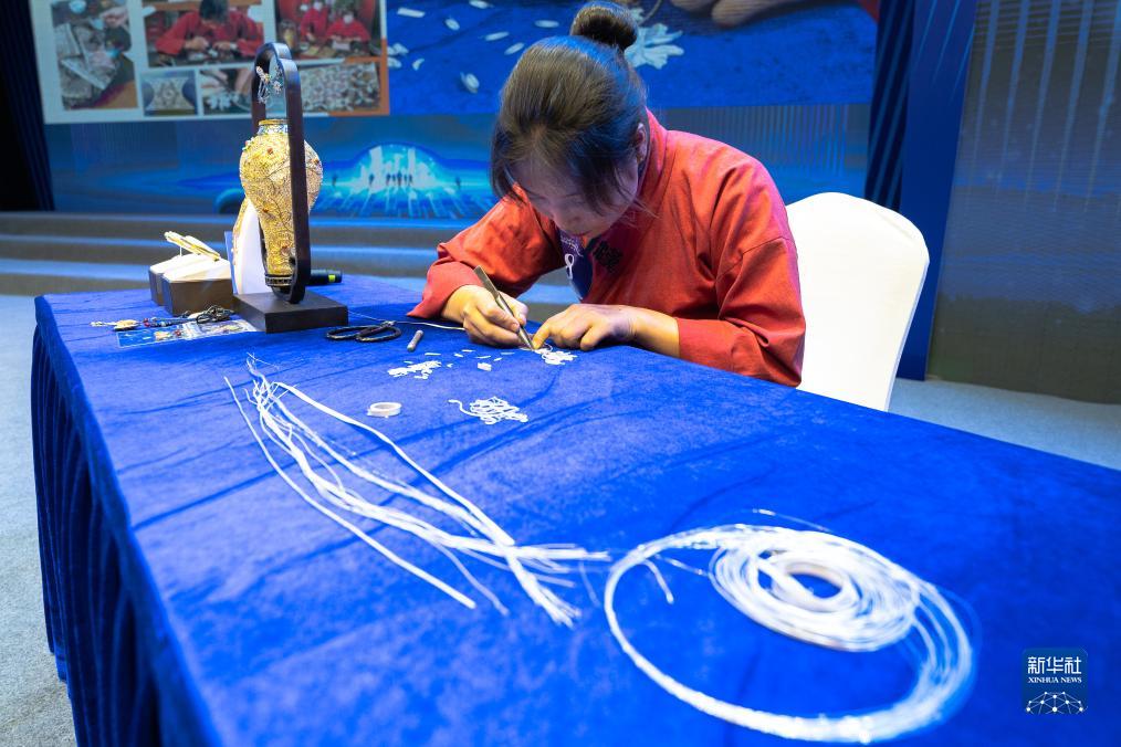 9月21日,选手李静在现场展示花丝首饰制作技艺。