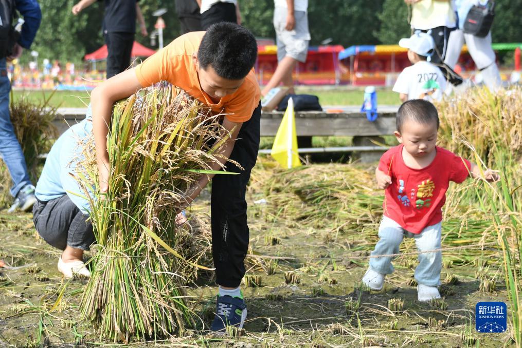 9月23日,在北京市海淀区上庄镇西马坊京西稻田,小朋友在活动中参加割稻子比赛。