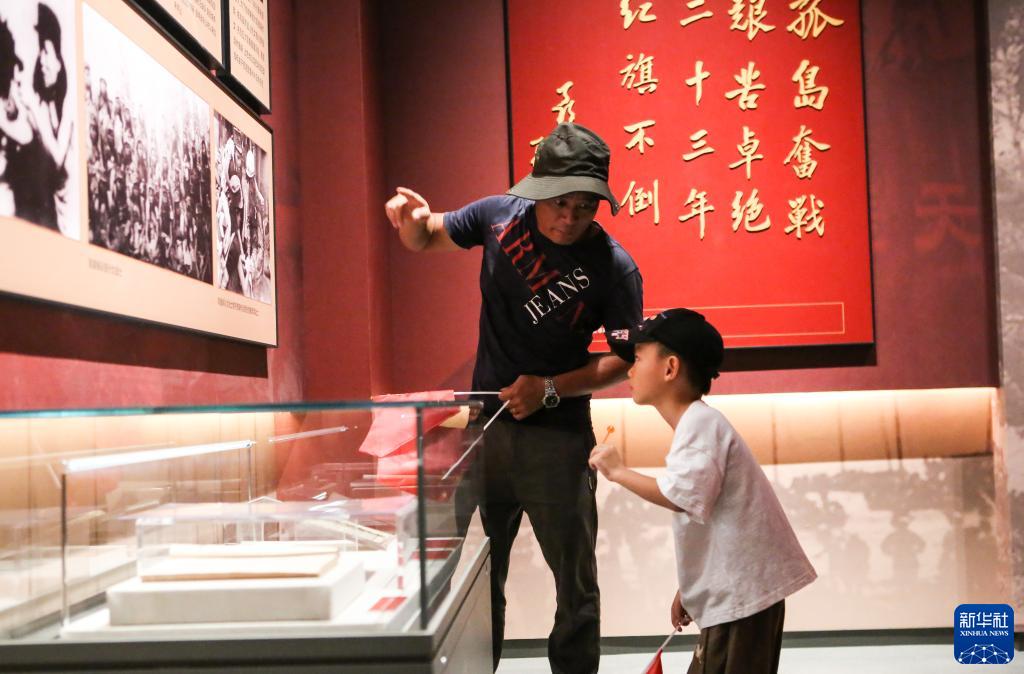 9月23日,在红色娘子军纪念园,家长为小朋友讲述历史。