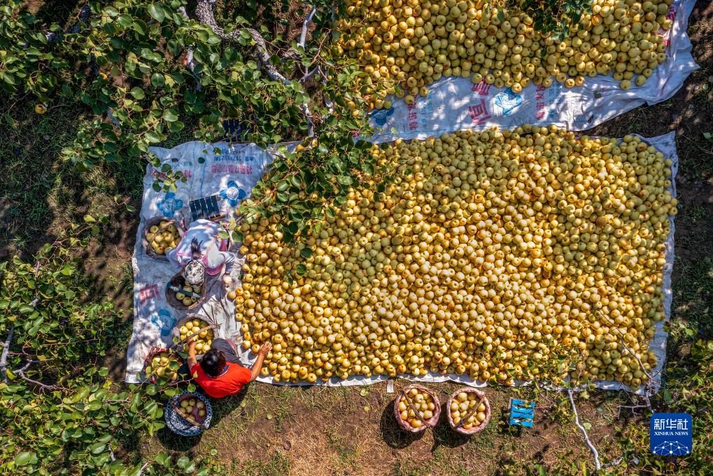 9月20日,安徽省宿州市砀山县园艺场工人在分拣刚采摘的砀山酥梨(无人机照片)。