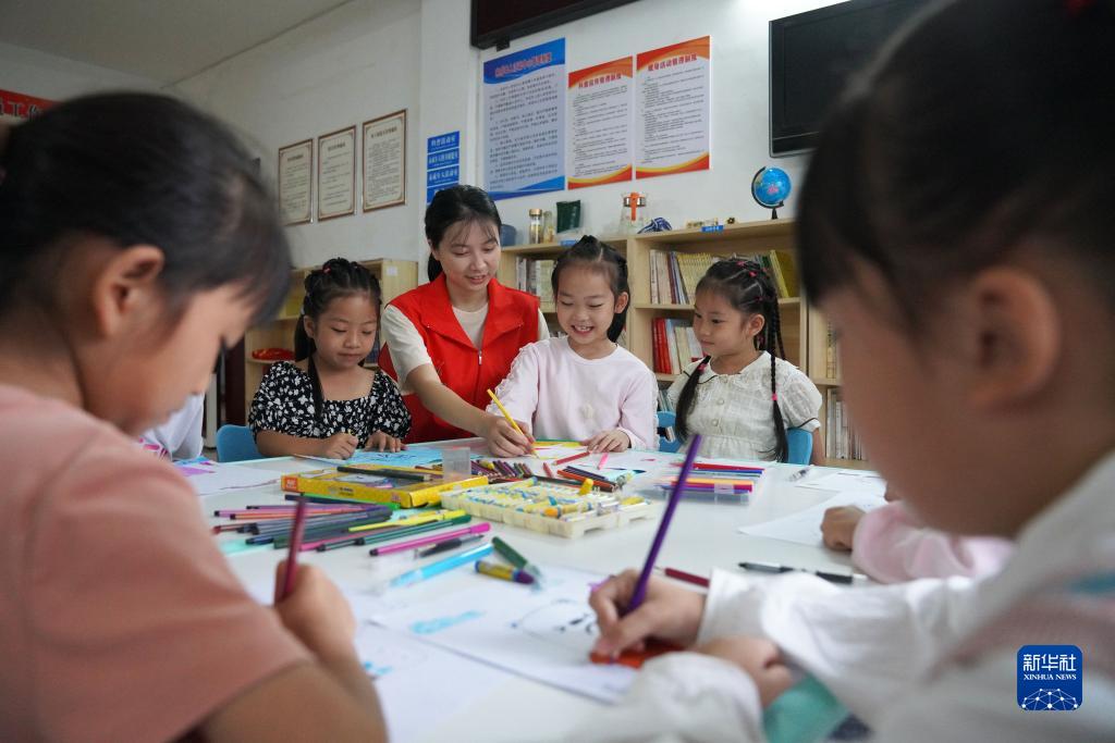 9月23日,在赤水市复兴镇新兴社区,“童伴妈妈”辅导孩子们绘画。