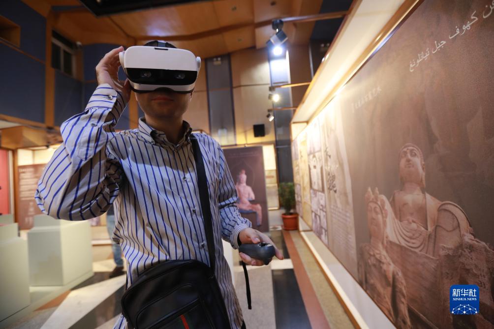 9月23日,一名参观者在埃及开罗举行的天龙山石窟数字复原国际巡展上体验AR佛像数字复原交互技术。