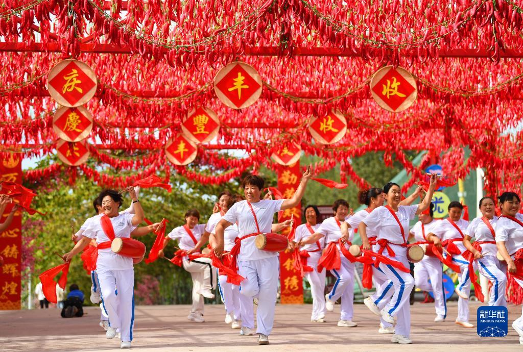 9月23日,迁安市文艺志愿者在该市亚滦湾农业公园进行腰鼓表演。