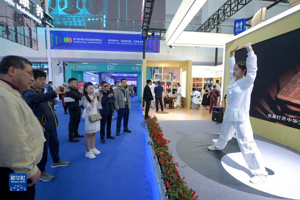 9月22日,观众在第六届中国-阿拉伯国家博览会医疗康养展区观看健身功法。