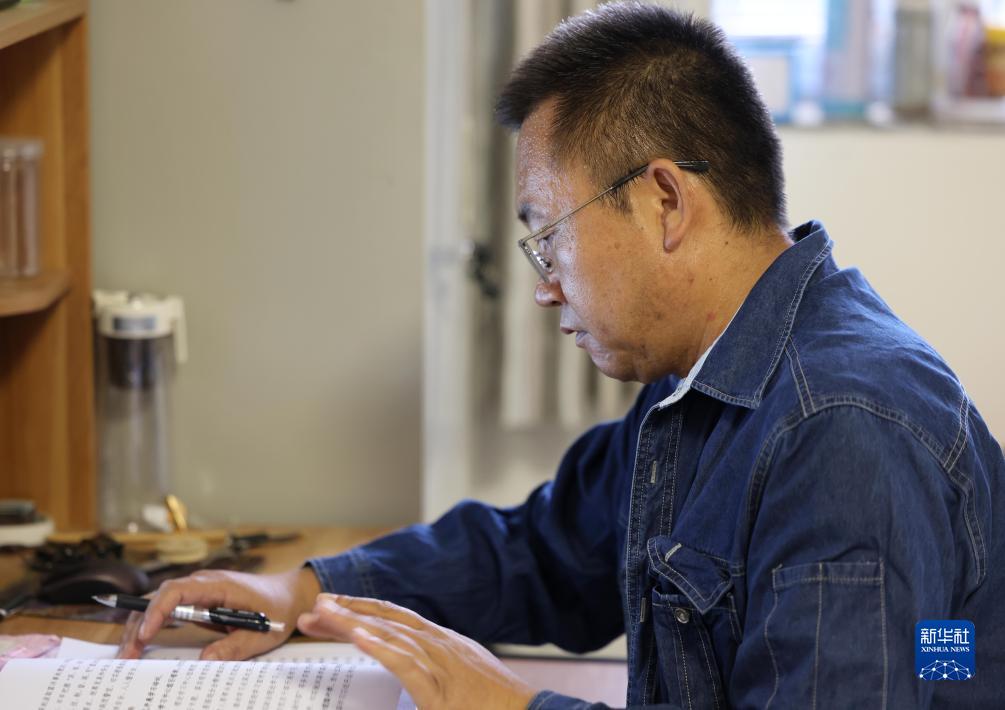 宁夏红寺堡扬水管理处红三泵站副站长赵金柱在泵站宿舍整理材料(9月7日摄)。