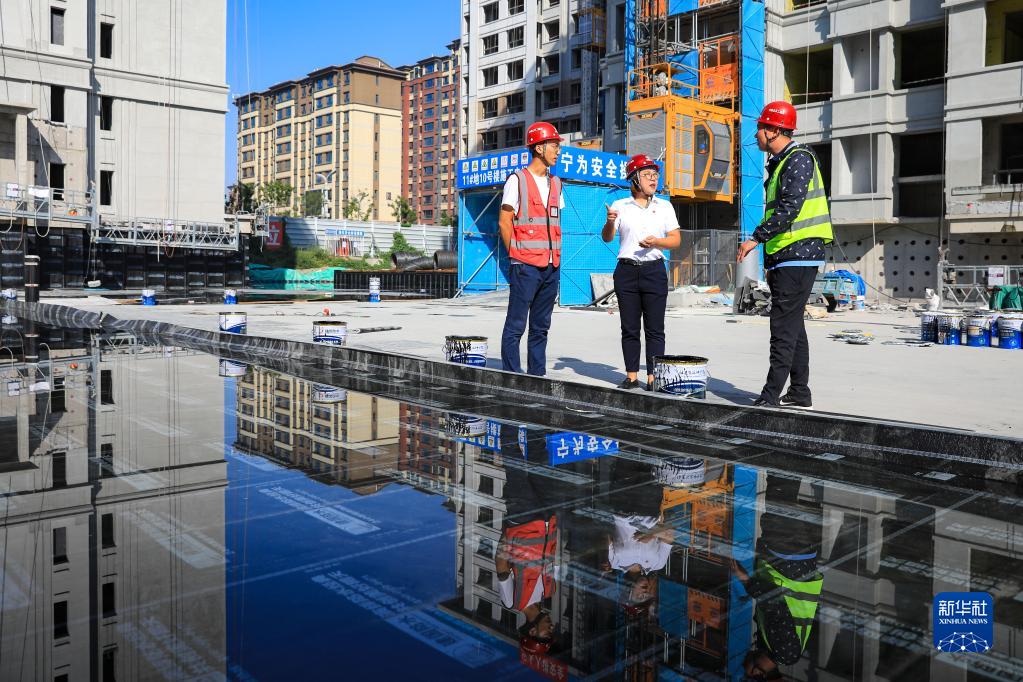 中铁北京工程局集团雄安指挥部高级工程师梁璐(中)在雄安新区容西片区一处安置房建设现场勘察建筑防水情况(9月21日摄)。