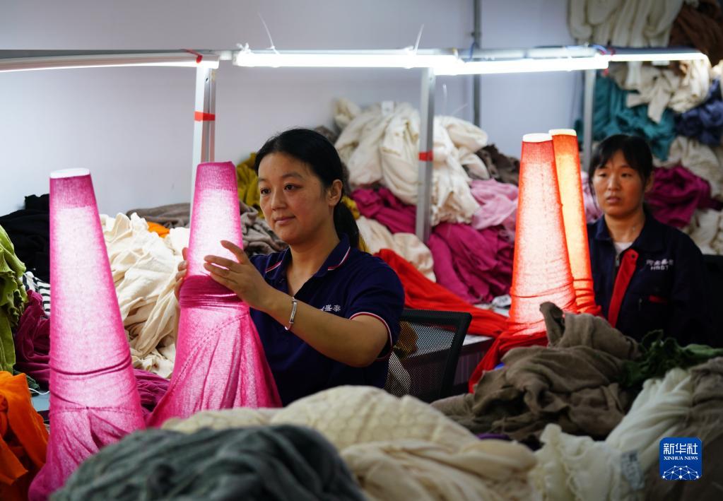 9月25日,河北省清河县一家羊绒制品生产企业的工作人员在检查羊绒衫质量。