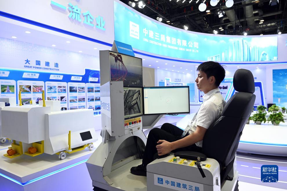 9月25日,中建三局工作人员在5G远程控制塔机操作台进行演示。