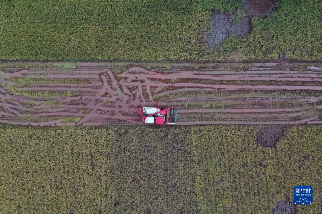 9月25日, 重庆市巫山县庙宇镇永安村村民在抢收受灾农田里的水稻(无人机照片)。