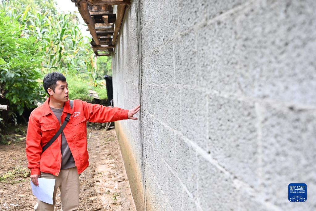 9月25日,地质工程师在重庆市巫山县笃坪乡腰栈村查看受损房屋情况。