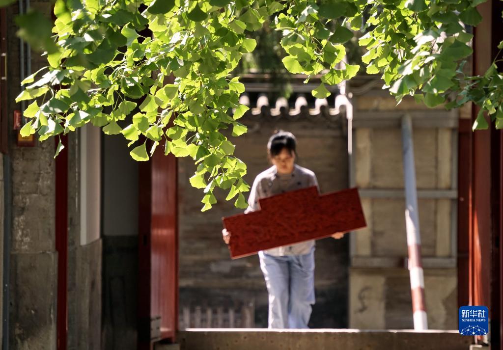 海燕在工作室搬运雕刻中的大型雕漆作品(9月21日摄)。