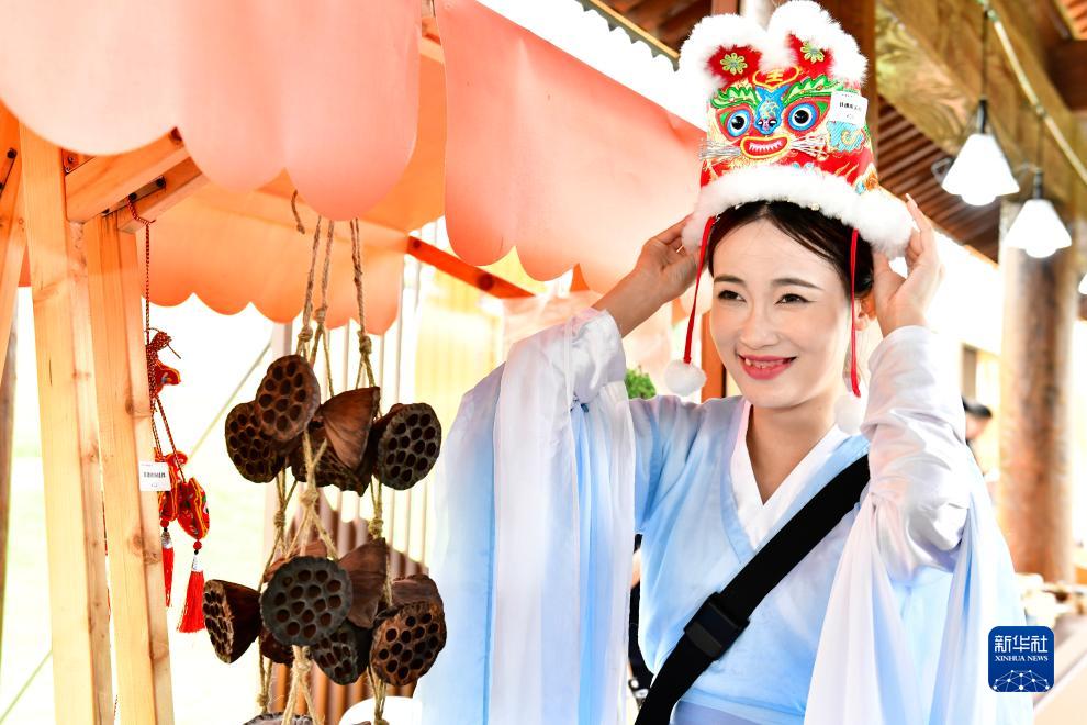 9月26日,在第九届尼山世界文明论坛“山东手造”精品展区,与会人员在试戴虎头帽。