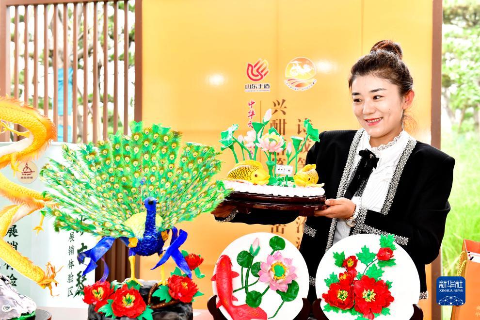 9月26日,在第九届尼山世界文明论坛“山东手造”精品展区,与会人员在展示山亭面塑作品。