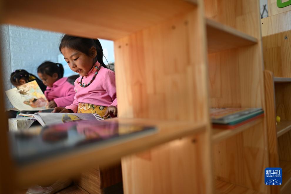 在曲麻莱县麻多乡幼儿园,美多永藏(右一)在课堂上阅读绘本(9月20日摄)。