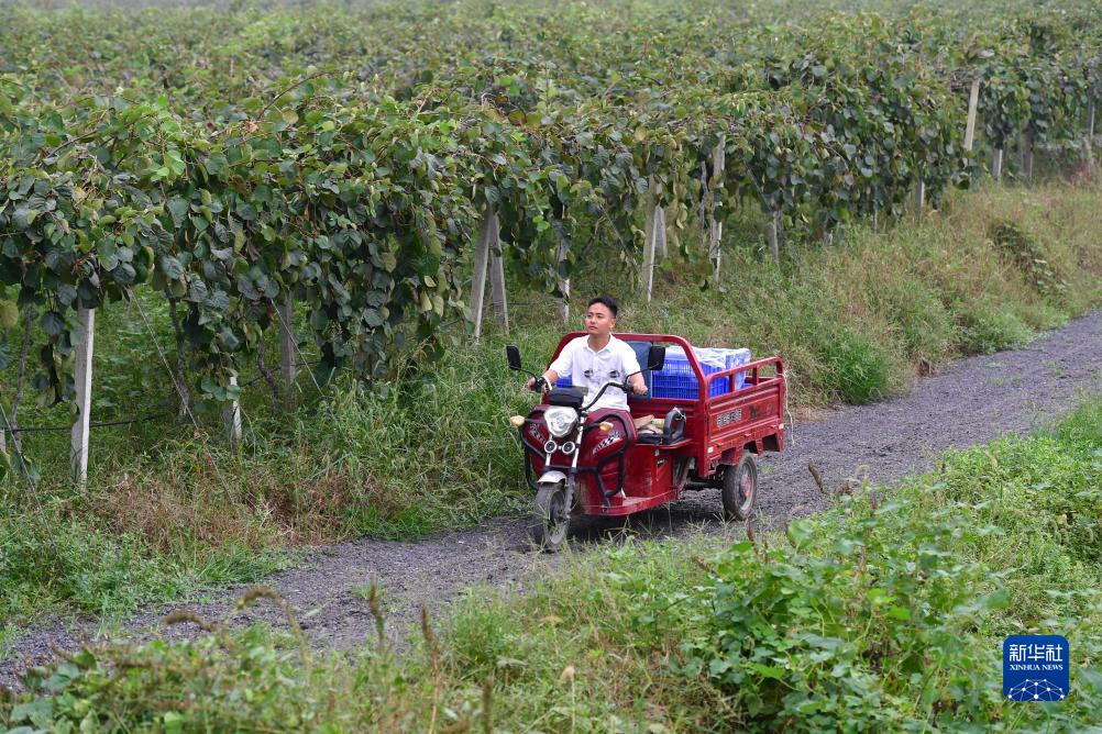 9月26日,段鹏飞在种植园里运送猕猴桃。