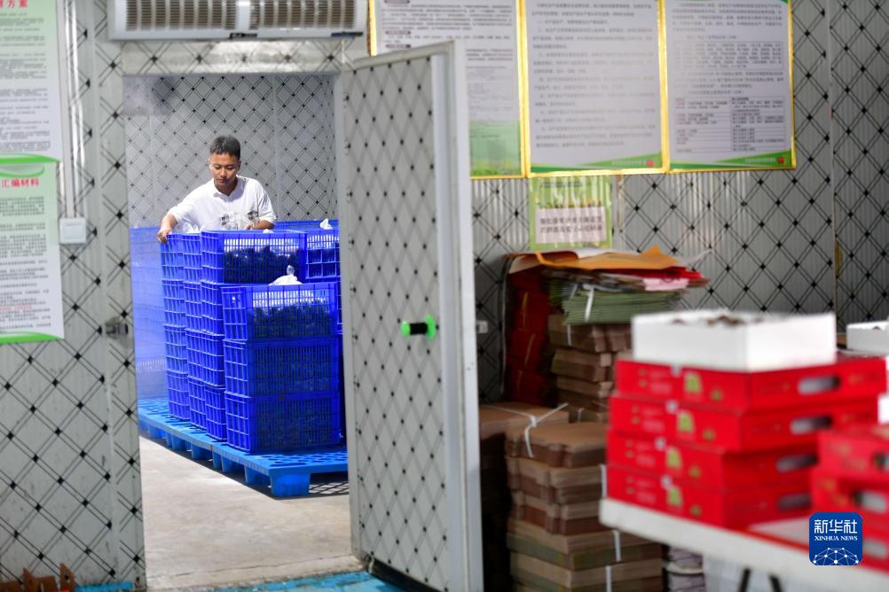 9月26日,段鹏飞在冷库里摆放猕猴桃。