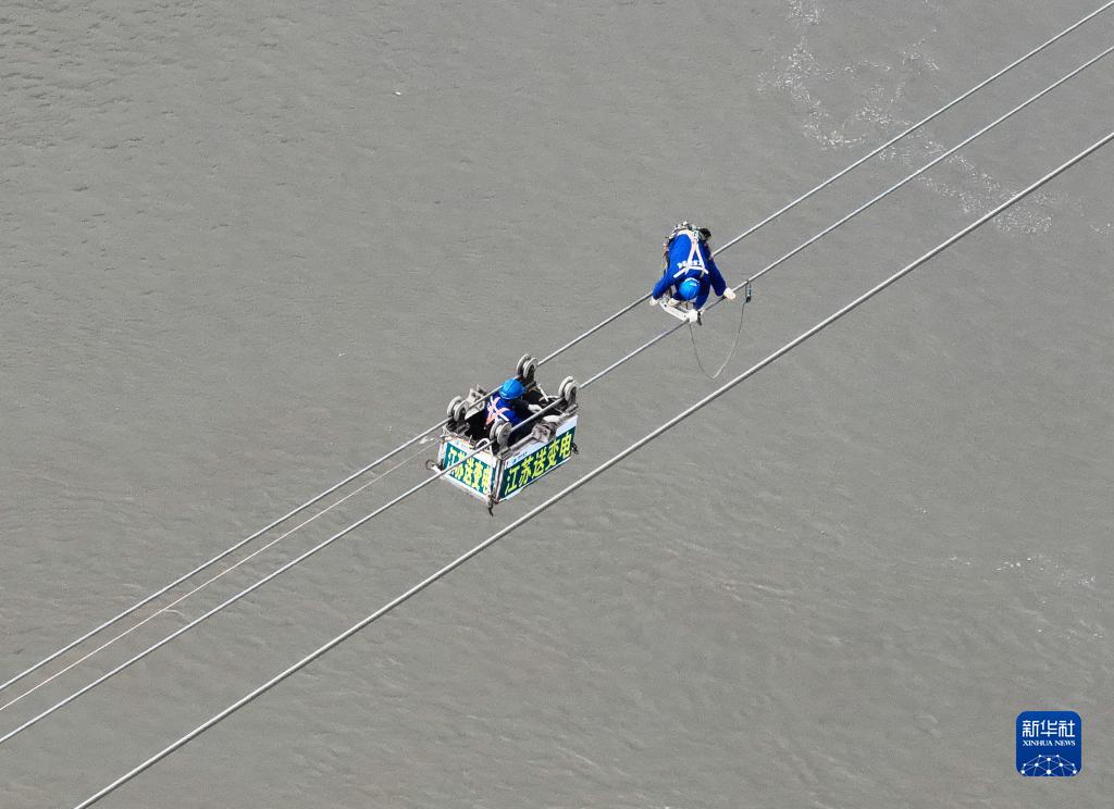 9月26日,在江苏镇江,国网江苏电力员工进行导线更换作业(无人机照片)。