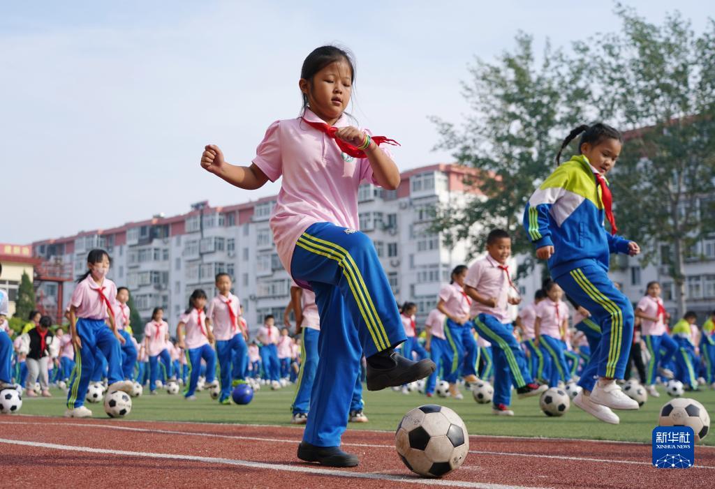 9月26日,河北省秦皇岛市海港区耀华小学的学生在大课间练习足球操。