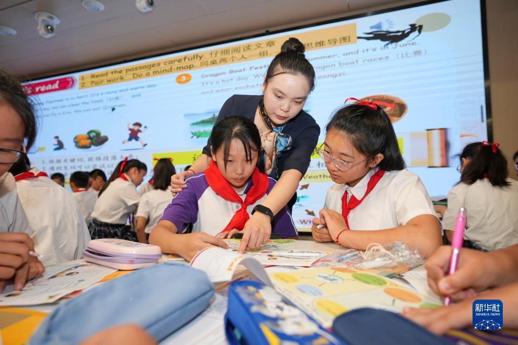 9月26日,在重庆铁路小学英语教学交流课上,城口县蓼子乡第一中心小学的一名学生代表(前左二)和铁路小学的学生们一起进行课堂英语练习。