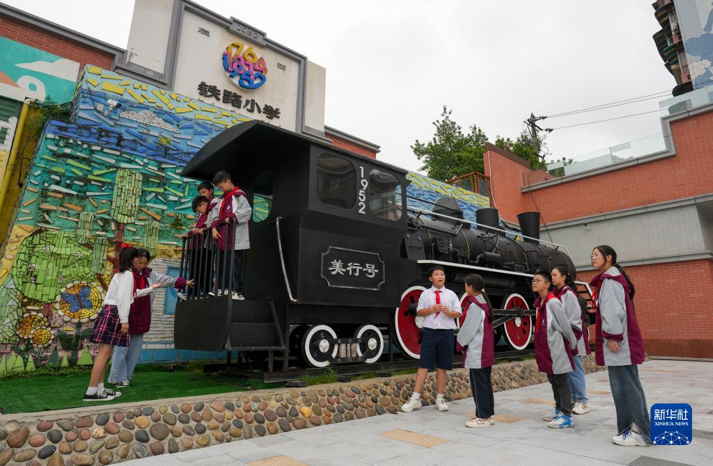 9月26日,在重庆铁路小学校园内的火车模型前,铁路小学的两名学生代表(左一、右五)向受邀来访的城口县蓼子乡第一中心小学学生代表介绍自己学校的历史。