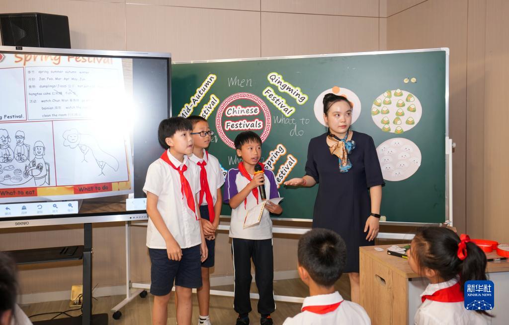 9月26日,在重庆铁路小学英语教学交流课上,城口县蓼子乡第一中心小学的一名学生代表(左三)和铁路小学的学生们一起进行课堂教学互动。