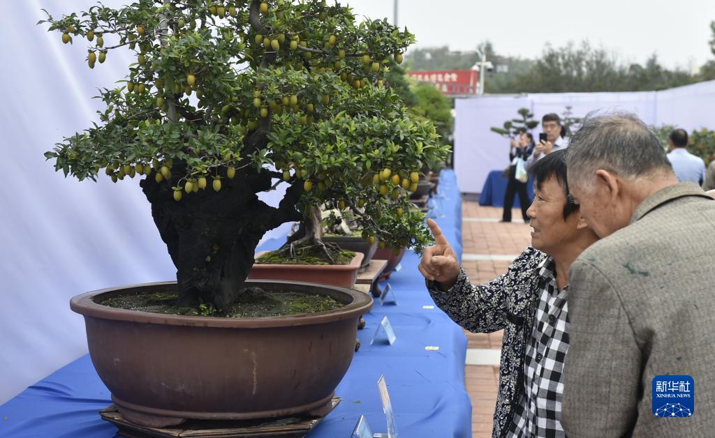 9月26日,观众在鄢陵县花博公园参观盆景。