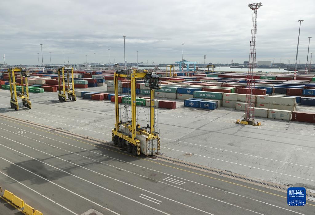 9月25日,在比利时安特卫普-布鲁日港中远海运(港口)泽布吕赫码头,工人驾驶跨运车作业。