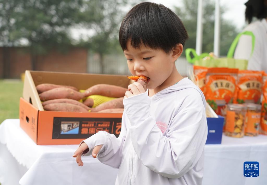 9月27日,一名小朋友在夏各庄镇第五届红薯文化节现场品尝红薯。