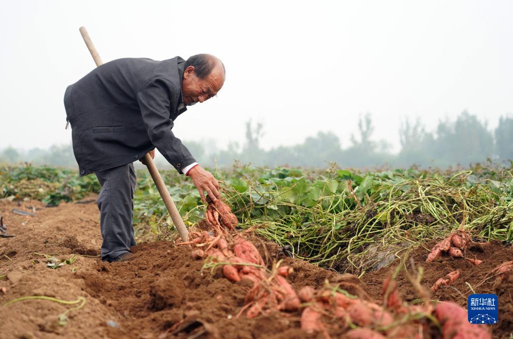 9月27日,在北京市平谷区夏各庄镇贤王庄村的一处红薯地,村民在挖红薯。