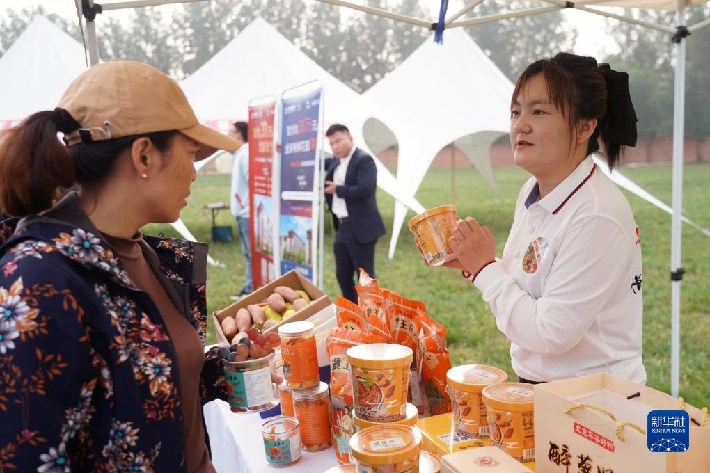 9月27日,在夏各庄镇第五届红薯文化节现场,工作人员(右)向游客介绍以红薯为原料制作的食品。