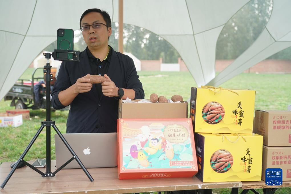 9月27日,工作人员在夏各庄镇第五届红薯文化节现场通过视频直播的方式售卖红薯。