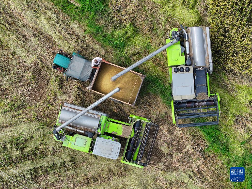 金秋时节,湖南省浏阳市沿溪镇种植的中稻迎来收获季,当地农民抢抓农时收割水稻,稻田里一派繁忙景象。