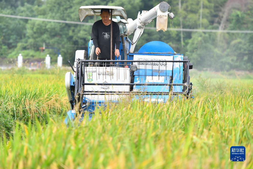 金秋时节,湖南省浏阳市沿溪镇种植的中稻迎来收获季,当地农民抢抓农时收割水稻,稻田里一派繁忙景象。