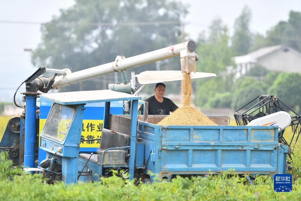 金秋时节,湖南省浏阳市沿溪镇种植的中稻迎来收获季,当地农民抢抓农时收割水稻,稻田里一派繁忙景象。
