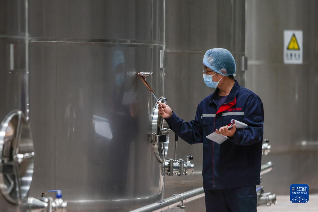 9月26日,在新疆吐鲁番市鄯善县楼兰酒庄,酿造工在生产车间巡查。