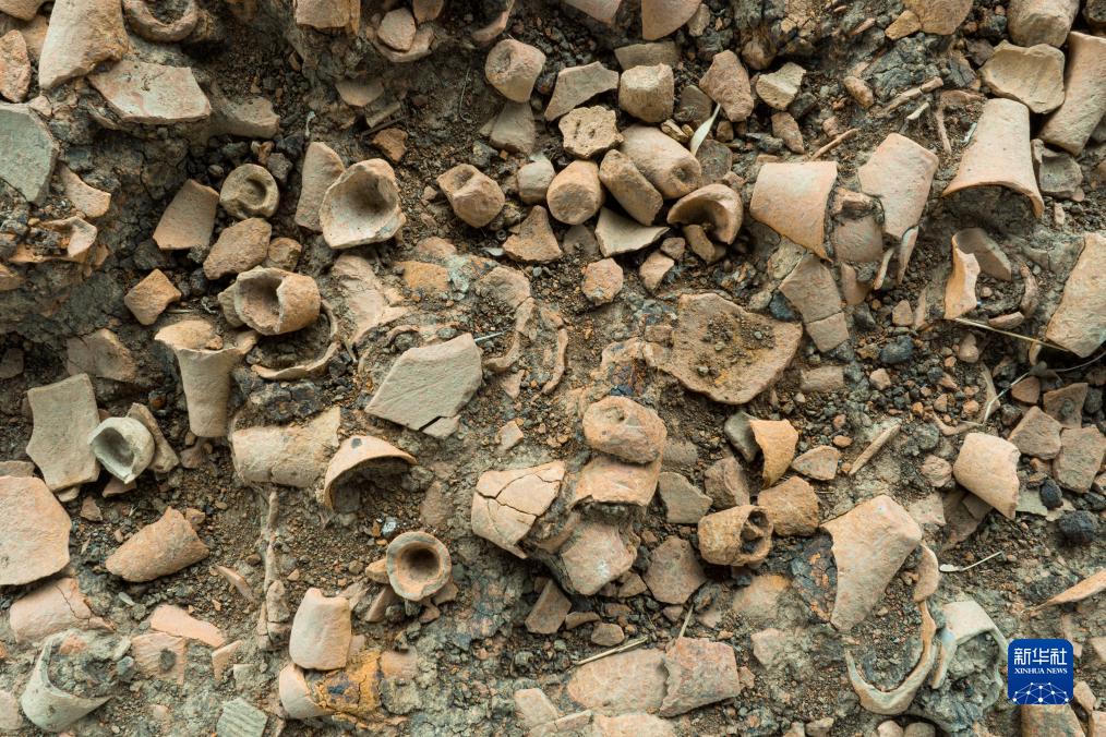 9月27日拍摄的石家河三房湾遗址出土的红陶杯(无人机照片)。