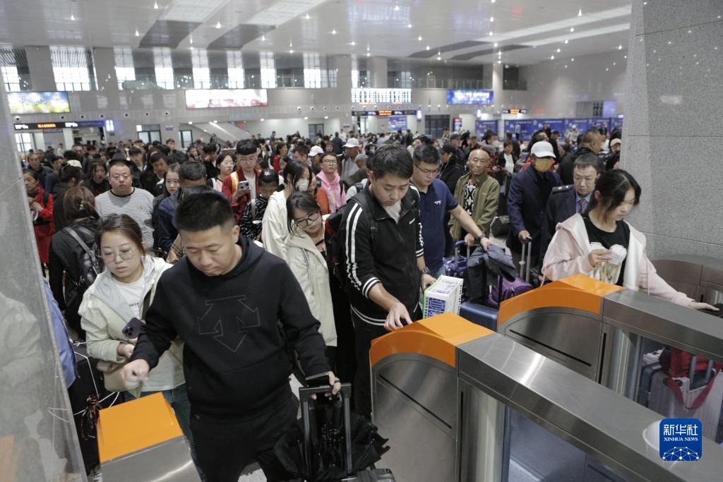 9月27日,旅客在黑龙江佳木斯站排队进站乘车。