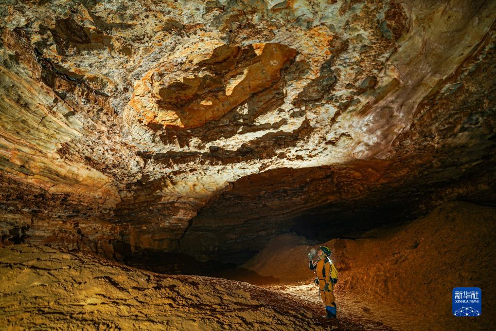 贵州省山地资源研究所科考队员在双河洞一处支洞中观察岩壁(9月23日摄)。