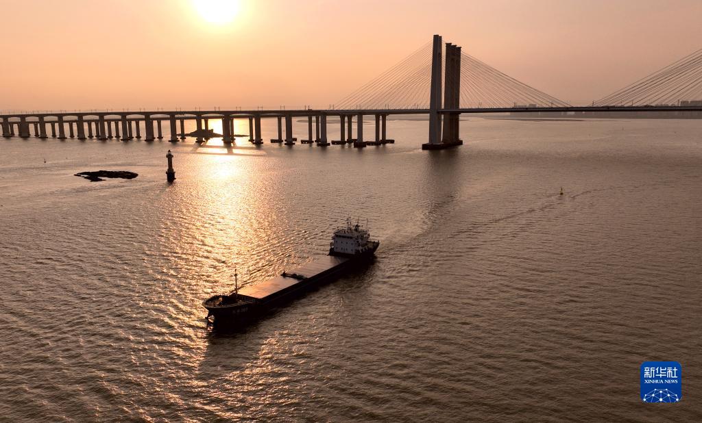 一艘货轮缓缓穿过福厦高铁泉州湾跨海大桥(9月18日摄,无人机照片)。