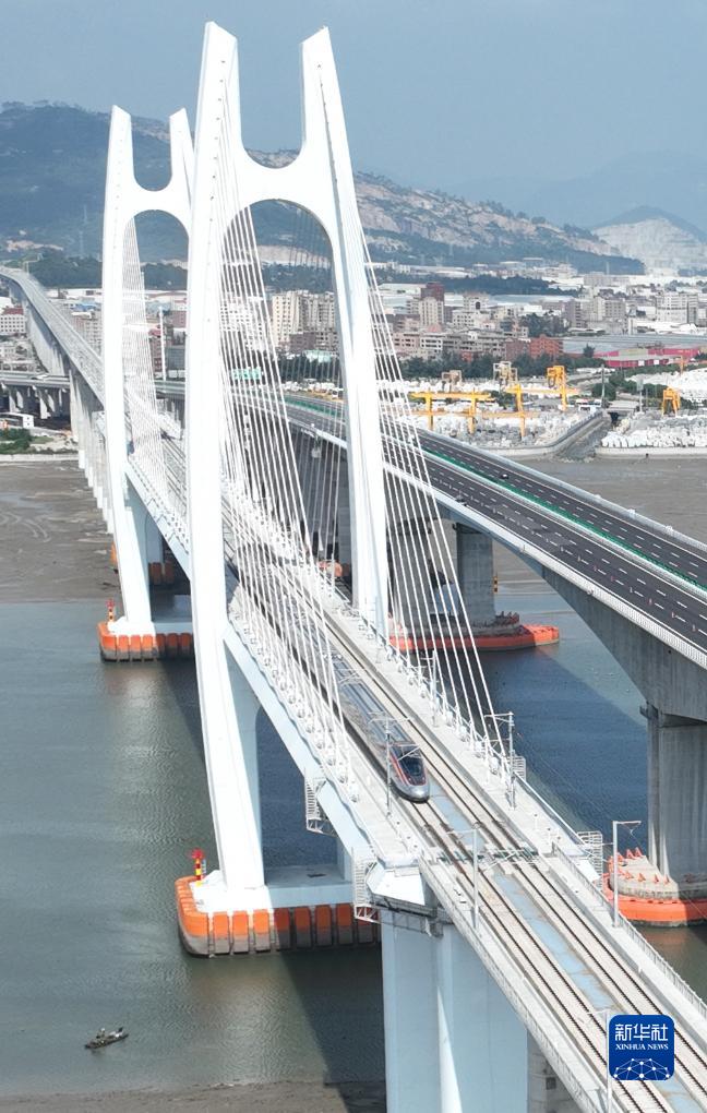 复兴号动车组驶过福厦高铁安海湾跨海大桥(9月19日摄,无人机照片)。